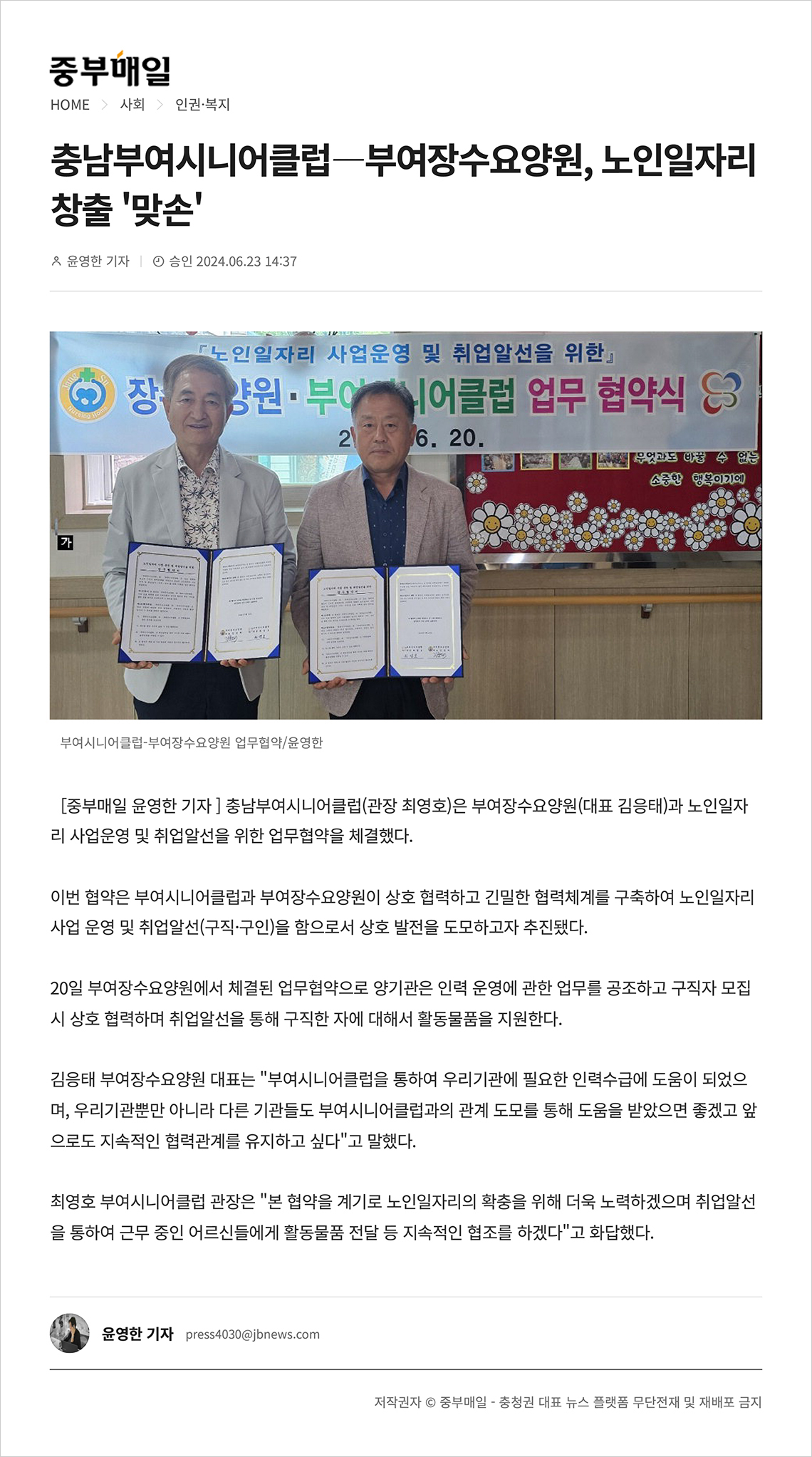 24.06.23 부여시니어클럽, 부여장수요양원 노인일자리 창출 '맞손'