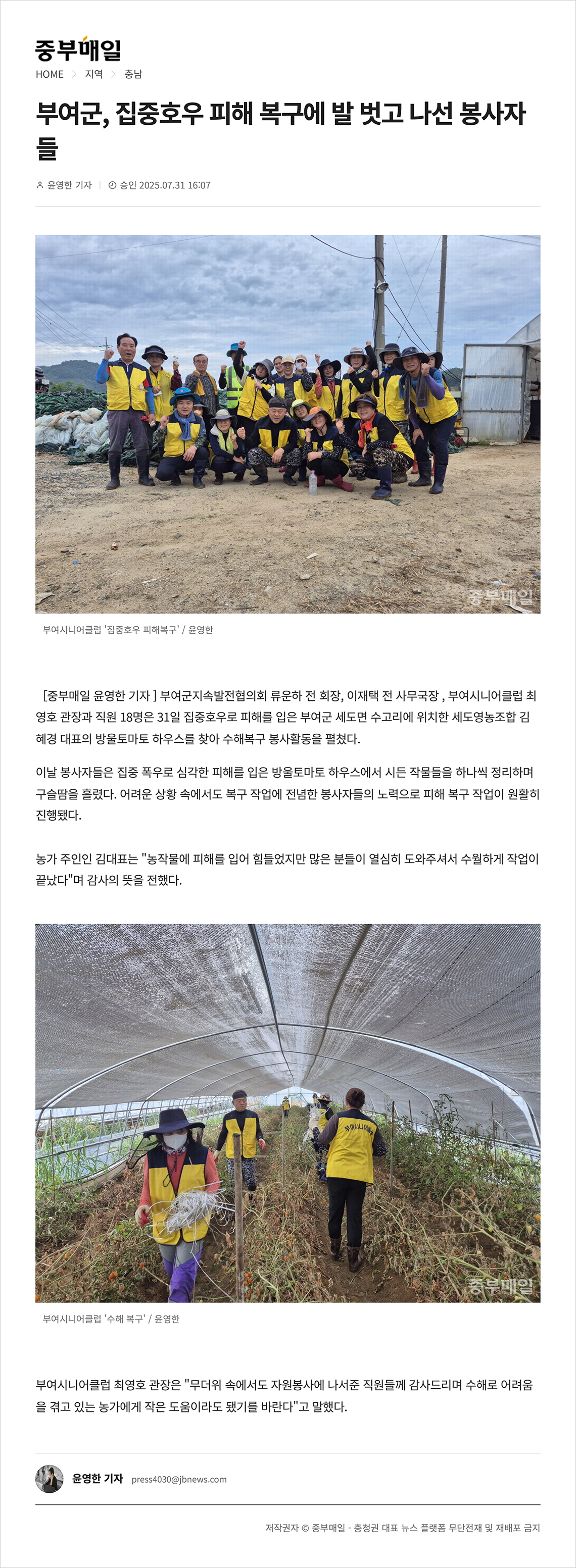 25.07.31 부여군 집중호우 피해 복구에 발 벗고 나선 봉사자들