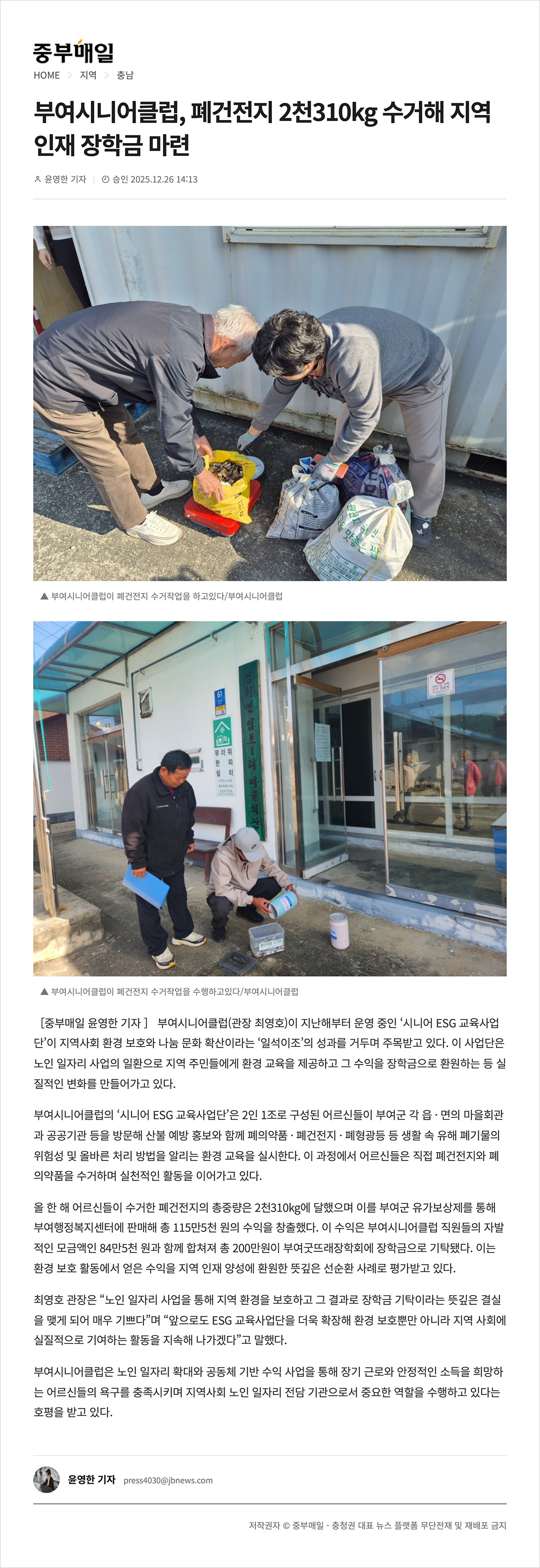 25.12.26 부여시니어클럽 폐건전지 2천310kg 수거해 지역 인재 장학금 마련